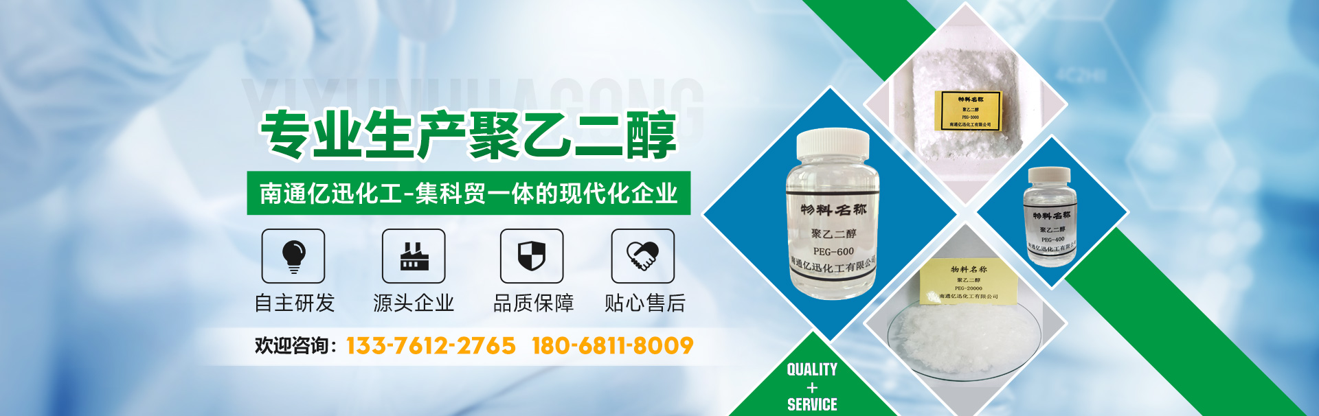 南通億迅化工有限公司是一個集科貿一體的現代化企業。主要經營界面活性劑產品:聚乙二醇、聚丙二醇、無規/嵌段聚醚、聚乙二醇單(雙)酯、醇醚磷酸酯(鉀鹽)、司盤、吐溫、勻染劑、乳化劑、滲透劑、消泡劑、洗滌劑...